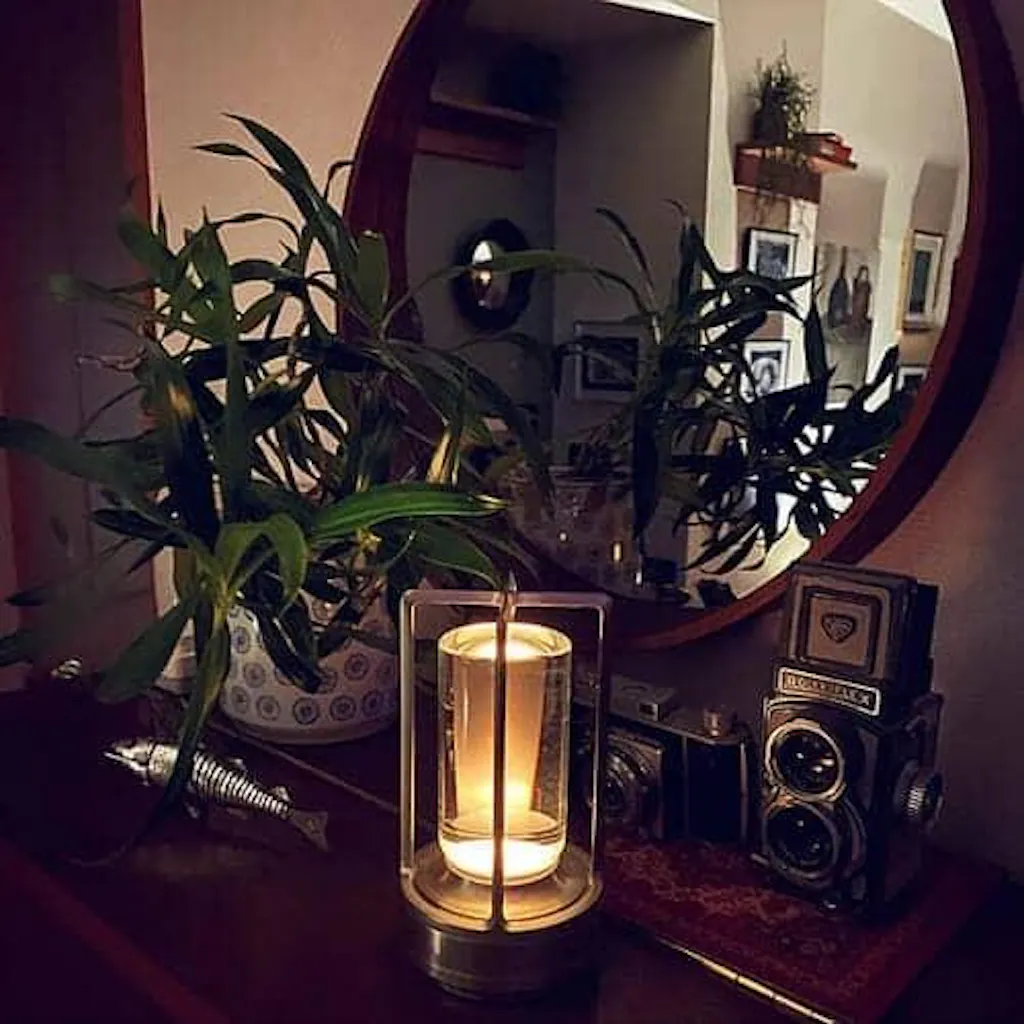 IP54 splash-resistant aluminium frame and crystal-clear light column move easily from dining room to patio or campsite.